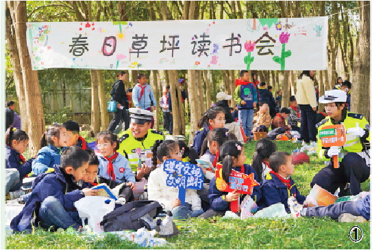 图① 淮安市公安局交通警察支队四大队民警在花海中为孩子们上安全课。