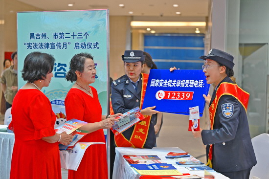 图③ 新疆出入境边防检查总站昌吉边境管理支队近日组织民警通过发放宣传手册、现场讲解等方式向群众宣讲宪法及国家安全、边境管理相关法律法规等,提升群众爱边、护边、守边意识。图为民警在昌吉市区人流量较大的商场开展普法。