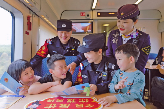 图① 近日,上海铁路公安局杭州乘警支队民警在列车上开展普法宣传,守护旅途平安。图为乘警与列车长在值乘列车上为小旅客讲解行车安全和反诈知识。