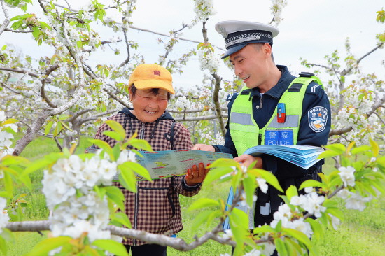 图② 江苏省东海县公安局交管大队石湖中队民辅警近日走进石湖乡石湖林场樱桃种植基地,开展交通安全法律法规宣传,为果农们送上“法治大礼包”。图为民警向果农普及交通安全知识。