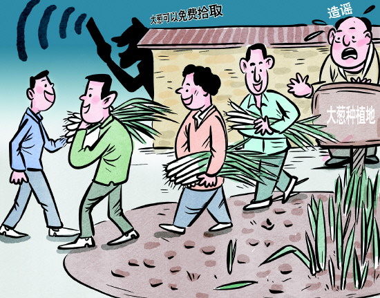 点评:一句谣言引哄抢,葱田受损农户伤,莫信流言乱效仿,法律底线不能忘。