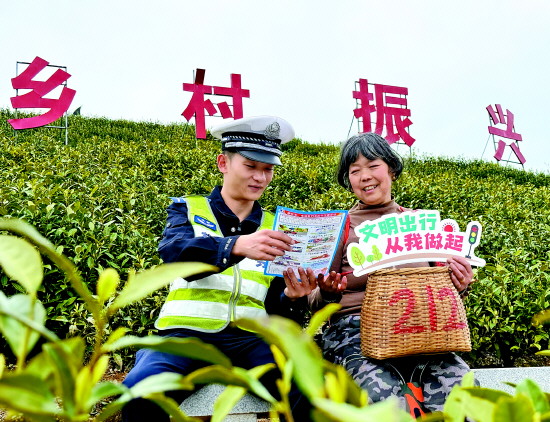 ▲ 近日,江西省武宁县公安局交管大队柯垅中队组织民辅警走进辖区茶园,通过唠家常、以案说法、互动答疑等方式,向茶农宣传“一盔一带”等交通安全知识。图为辅警提醒茶农安全驾驶、文明出行。 本报记者 黄辉 本报通讯员 熊遥 于锦庭 摄
