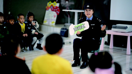 ▲ 图为陕西省西安市公安局西咸新区分局渭城派出所社区民警第艳妮走进西北电力建设第四工程有限公司幼儿园,向孩子们讲解防拐卖知识。