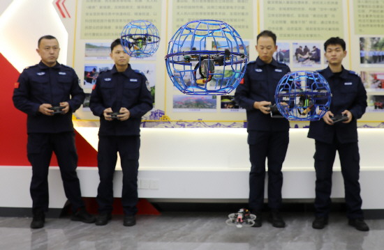 图① 近日,江西省九江市公安局濂溪分局制定无人机警务智能应用标准,民辅警通过训练掌握了超视距抛投、高空搜救、侦查取证等20多种警务技战法。图为民辅警在演练技战法。