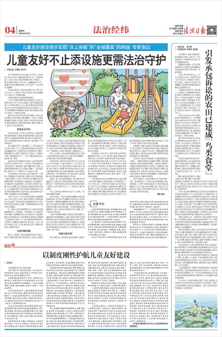 “其次是推动专项立法与制度完善。将儿童友好融入城乡规划、建筑设计等法律法规,从‘倡导性要求’上升为‘法定义务’,支持有条件的地方出台地方性法规。”苑宁宁说,同时要建立儿童影响评估与跨部门协调机制,对于重大公共政策、建设项目须开展儿童影响评估,明确部门职责,健全考核问责。此外,须完善标准体系与监督评估,加快制定公共空间、交通出行、公共服务等领域的儿童友好国家标准和行业标准,引入第三方评估,定期公开结果,强化社会监督。