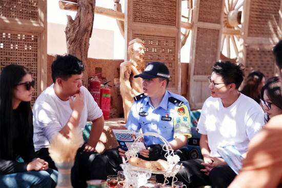 为切实守护好广大游客的“钱袋子”,近日,新疆维吾尔自治区鄯善县公安局吐峪沟乡派出所民警化身“平安守护者”,在辖区景区开设反诈“平安下午茶”。图为民警向游客讲解识骗防骗技巧。 本报记者 潘从武 本报通讯员 钱维栋 摄
