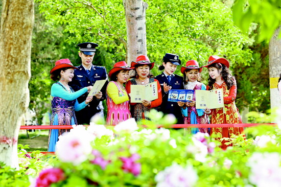 4月16日,新疆维吾尔自治区库尔勒市梨香园公园的牡丹花竞相开放,前来打卡拍照的市民络绎不绝。乌鲁木齐铁路公安局库尔勒公安处库尔勒站派出所民警对赏花群众开展防范电信网络诈骗宣传。图为民警向群众普及识骗防骗技巧。 本报记者 潘从武 本报通讯员 陈云龙 摄