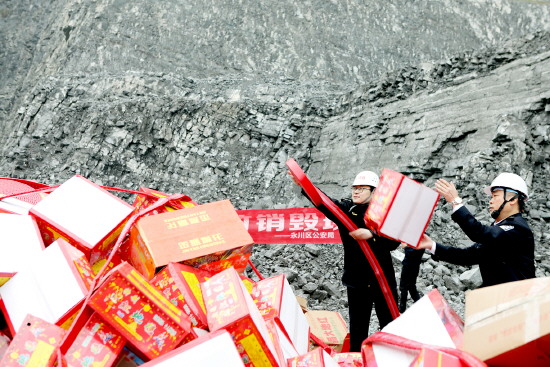 近日,重庆市永川区应急管理局等部门在永川区红炉镇开展“永川区非法烟花爆竹集中销毁活动”。活动中,执法人员将从去年以来收缴的1万余件、价值2500余万元的非法烟花爆竹进行了集中销毁。图为执法人员现场检查清理准备销毁的非法烟花爆竹。 本报通讯员 陈仕川 摄