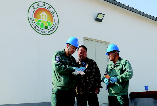 近日,国网奎屯供电公司组织工作人员对辖区供电设施和用户水井进行全面排查,并开展电力普法宣传活动。图为供电公司工作人员向水井用户发放宣传手册、讲解安全用电知识。 刘兆新 摄