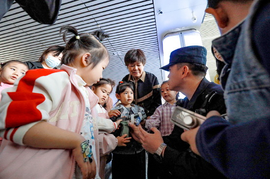 图③ 4月16日,乌鲁木齐铁路公安局哈密公安处哈密站派出所将安全课堂“搬”进候车室,为哈密市第四幼儿园的部分师生、家长带来一堂沉浸式铁路安全实践课。图为民警让孩子在互动体验中学习安全法规。
