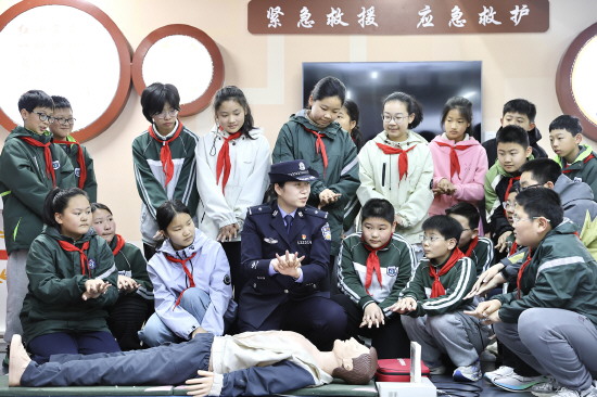 图① 近日,江苏省宿迁市公安局宿豫分局珠江路派出所联合辖区学校开展安全宣传活动。民警通过案例讲解、互动交流等形式向学生普及日常安全知识,增强学生安全防范意识。图为民警向学生教授急救知识。