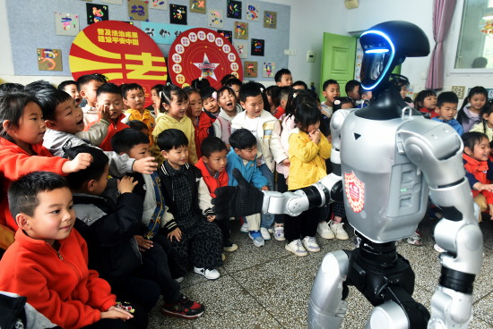 4月13日,重庆市云阳县人民法院邀请专业技术人员协同参与开展全民国家安全教育日暨《中华人民共和国爱国主义教育法》主题普法宣传活动。人形机器人、四足机器狗齐上阵,将现代科技融入总体国家安全观教育,为乡村少年儿童带来一堂鲜活而生动的“智慧科技+民主法治”普法课。图为幼儿园的小朋友与机器人、机器狗挥手告别。 本报记者 战海峰 本报通讯员 饶国君 摄