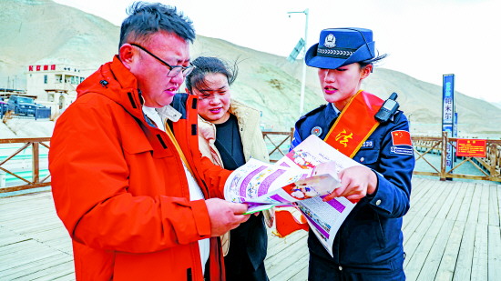 4月16日,新疆维吾尔自治区司法厅、新疆出入境边防检查总站、克孜勒苏柯尔克孜自治州文旅局、克州司法局、阿克陶县公安局及克州边境管理支队联合举办“法润边关 法治同行”主题普法宣传活动。图为民警在活动现场向群众普及出入境管理法律知识。 本报记者 潘从武 本报通讯员 彭虎成 摄