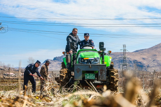 近日,吉林出入境边防检查总站通化边境管理支队阳岔边境派出所民警利用业余时间深入田间地头,帮助辖区劳动力不足家庭抢抓农时,以实际行动护航春耕备耕有序推进。图为民警帮助村民备耕。