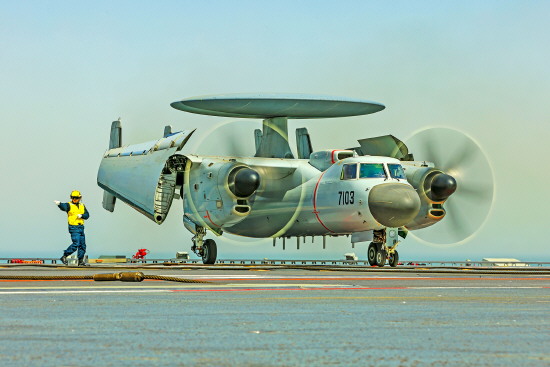 图为引导员引导空警-600舰载预警机滑行。 本报通讯员 姜涛 摄