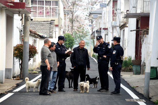 ▲ 近日,安徽省亳州市涡阳县公安局组织社区民辅警走村入户排查安全隐患、化解矛盾纠纷。图为民辅警为社区居民讲解防火防盗等安全知识。 本报通讯员 吴胜利 摄