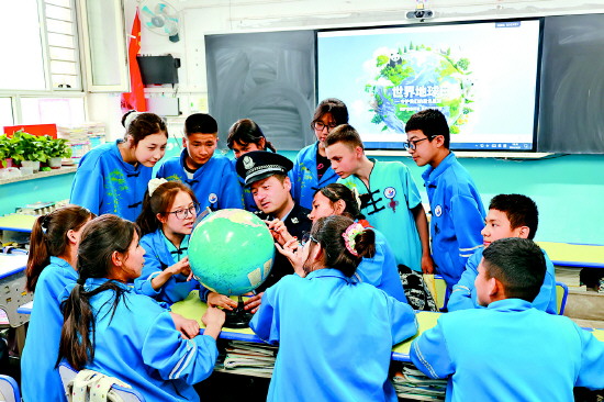 4月22日是第57个世界地球日。为进一步加强青少年生态环境保护教育,4月21日,新疆维吾尔自治区阿瓦提县公安局组织民警走进辖区英艾日克镇中学,为学生们上了一堂“生态环境法治宣传课”,引导学生们积极参与生态环境保护。图为民警为学生们讲解生态环境保护知识。 本报记者 潘从武 本报通讯员 胡国华 摄