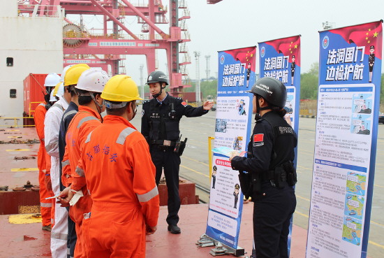 图③ 近日,南京港出入境边防检查站组织民警走进江苏南京港龙潭港区,为货船船员普及相关安全防范以及法律知识,切实增强口岸一线人员的安全防范和法治意识。图为民警向船员讲解国家安全法律法规。