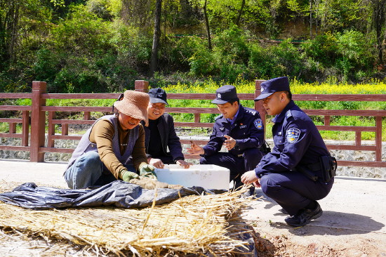 图② 近日,甘肃省徽县公安局柳林派出所民辅警深入田间地头,利用群众农忙间隙开展普法宣传,护航农业生产。图为民辅警走进柳林镇洛坝村为村民普法。
