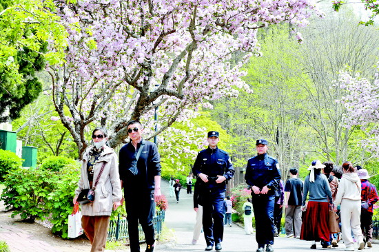 近日,山东青岛中山公园一年一度的樱花节如期而至。青岛市公安局市南分局民辅警深入园区开展巡逻,全程守护景区秩序与游客安全。图为民辅警在公园巡逻执勤。