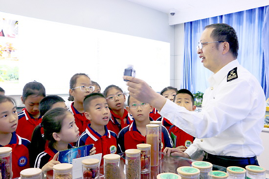 近日,乌鲁木齐海关所属库尔勒海关联合新疆库尔勒市第八中学,开展国门生物安全进校园活动。活动现场,库尔勒海关关员通过展示有害生物标本、带领学生参观果园监测设施等多种形式,讲解进出境检验检疫的必要性及外来有害生物入侵的危害,引导青少年树立总体国家安全观。图为海关关员向学生展示生物样本。