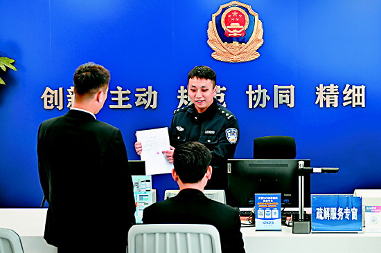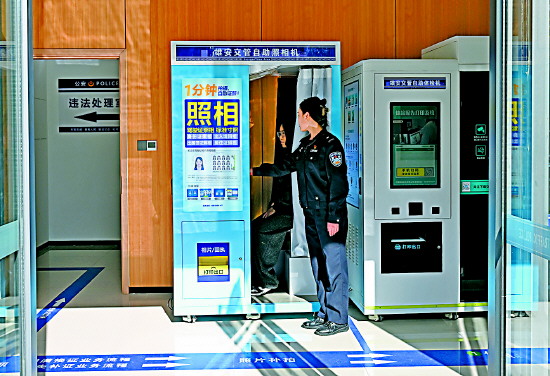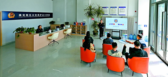 雄安新区公安局启动区交警大队民警岳圆在交管自助服务站指导群众办理驾驶证业务。