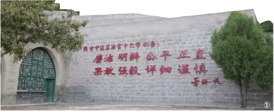 图① 法院山的半山腰上,“廉洁、明辨、公平、正直、强毅、果敢、详细、谨慎”十六字训条镌刻在陕甘宁边区高等法院旧址的显著位置。