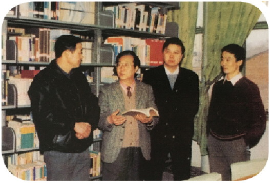 图为1984年,张晋藩(左二)与中国政法大学首届法学博士生郑秦(左一)、怀效锋(右二)、朱勇(右一)在图书馆交流。