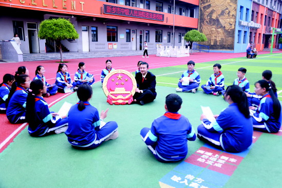 ▲ 近日,河南省新乡市中级人民法院组织干警走进辖区中小学开展“春日普法进校园”主题法治宣讲活动。图为法院干警通过游戏互动,向学生讲解国徽法等法律法规。 本报记者 赵红旗 本报通讯员 韦德涛 摄
