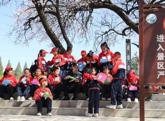 近日,甘肃省镇原县公安局城关派出所民警以辖区城关镇中心小学春游为契机,开展法治宣传,守护学生健康成长。图为民警向学生们普及法律知识。