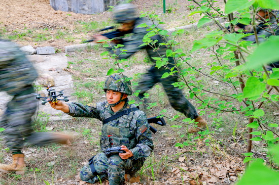 图为在山林地搜剿课目演练中,刘昌金利用穿越机进行前出侦察。 本报通讯员 康旭东 摄