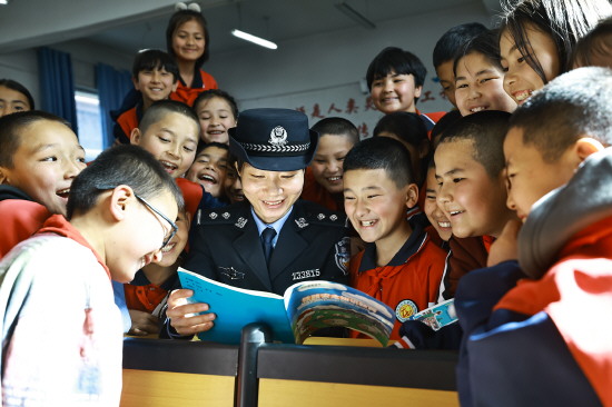 “五一”假期临近,为增强辖区中小学生的铁路安全意识,保障铁路运输安全,近日,乌鲁木齐铁路公安局库尔勒公安处库车站派出所组织警力深入辖区各中小学,向学生开展形式多样的铁路安全主题宣讲活动。图为学生们向民警展示自己创作的铁路安全主题手抄报。